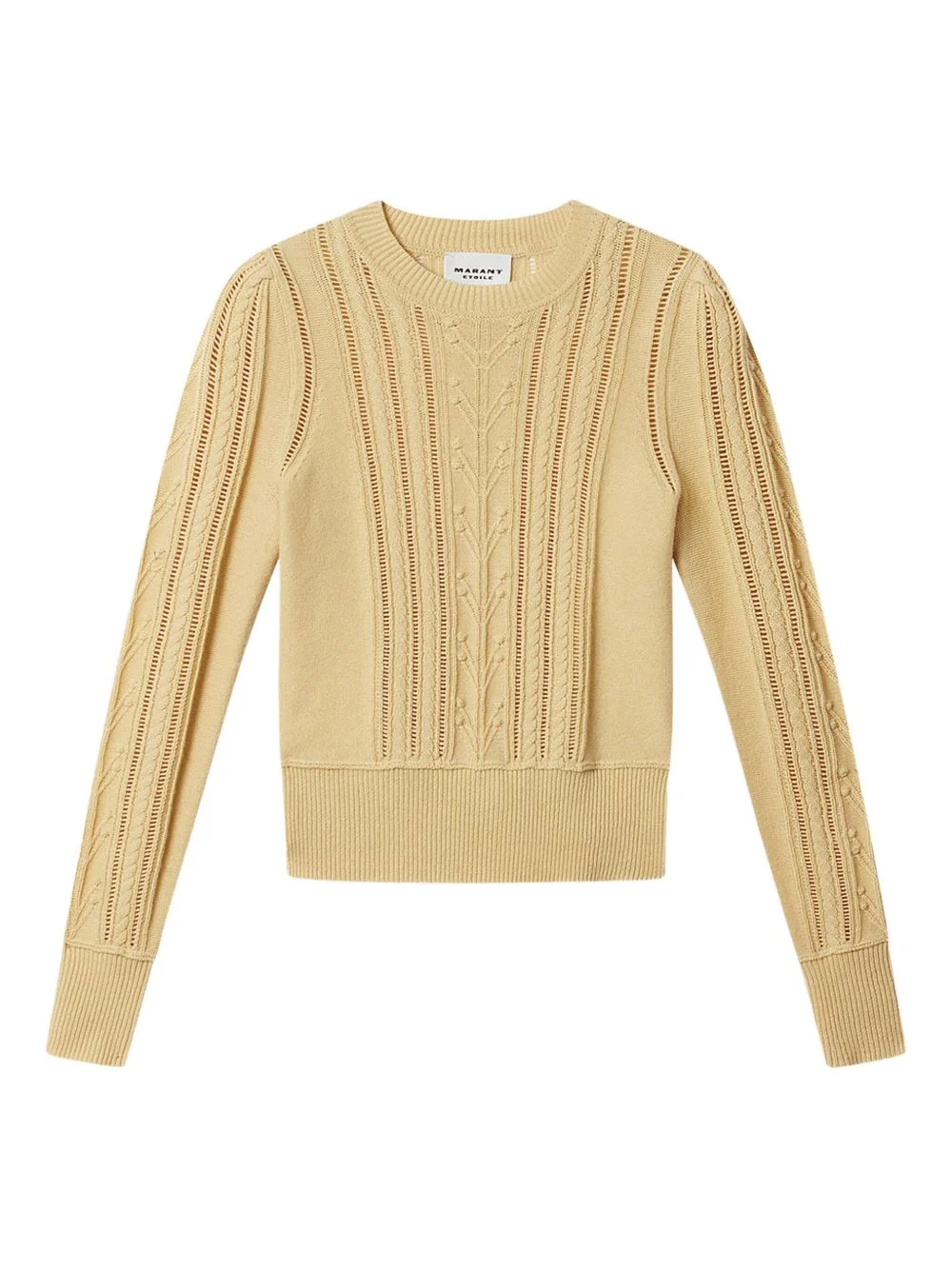 Kalyn openwork sweater Highlights - Light yellow - Openwork detailing - Cable knit - Round neck - Long sleeves - Ribbed hem Imported Composition Cotton 70%, Wool 30% Washing instructions Read Manufacturer Guidelines
