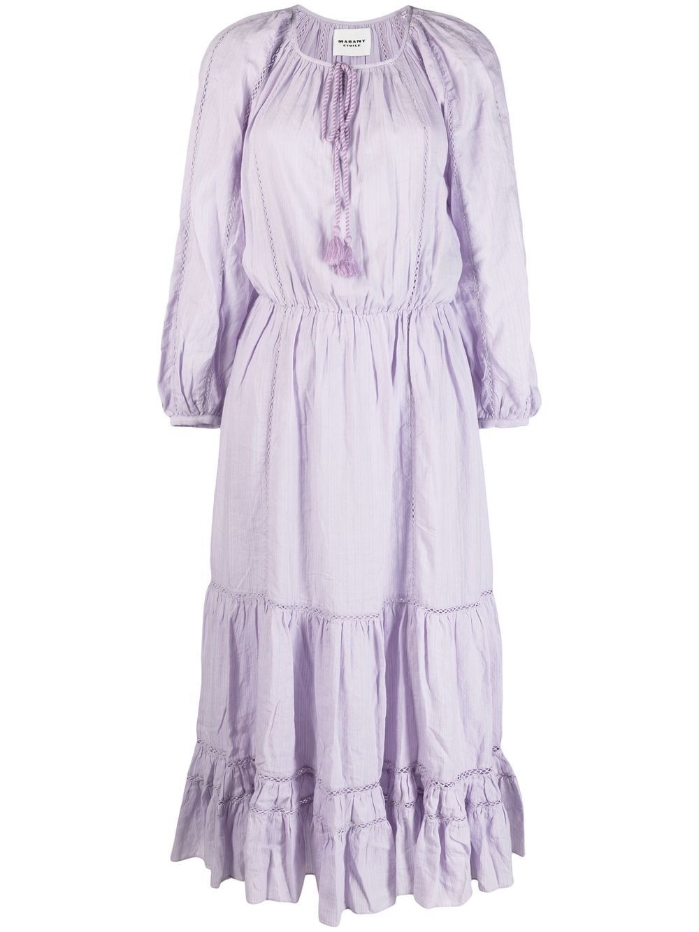 Latifa flared midi dress Highlights - Lilac purple - Cotton - Pleat detailing - Keyhole neck - Front tie fastening - Long sleeves - Elasticated waistband - Tiered skirt Imported Composition Lining: Cotton 100% Outer: Cotton 60%, Linen/Flax 36%, Viscose 4% SIZE & FIT Model measurements Height 5 ft 10 in(1.79 m) Bust/Chest 31.1 in(79 cm) Hips 35.03 in(89 cm) Waist 24.01 in(61 cm) Measurement BUST 40.15 in(102 cm) LENGTH 51.96 in(132 cm) WAIST 28.34 in(72 cm) SLEEVE LENGTH 16.92 in(43 cm) HIPS 50.39 in(128 cm)