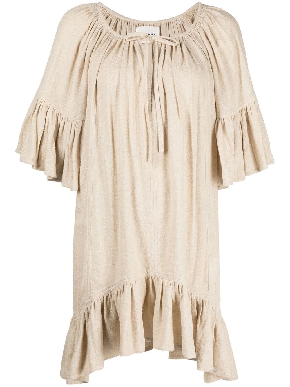 Loane mini dress Highlights - Ecru - Silk - Ruffled detailing - Front tie fastening - Round neck - Short sleeves - Above-knee length Imported Composition Body: Silk 100% SIZE & FIT Model measurements Height 5 ft 10 in(1.77 m) Bust/Chest 31.49 in(80 cm) Hips 35.43 in(90 cm) Waist 25.19 in(64 cm) FittingInformation This piece fits true to size. We recommend you get your regular size Cut for a loose fit Made with a mid-weight non-stretch fabric Measurement BUST 43.3 in(110 cm) LENGTH 33.46 in(85 cm) SLEEVE LENGTH 7.87 in(20 cm) Washing instructions Dry Clean Only