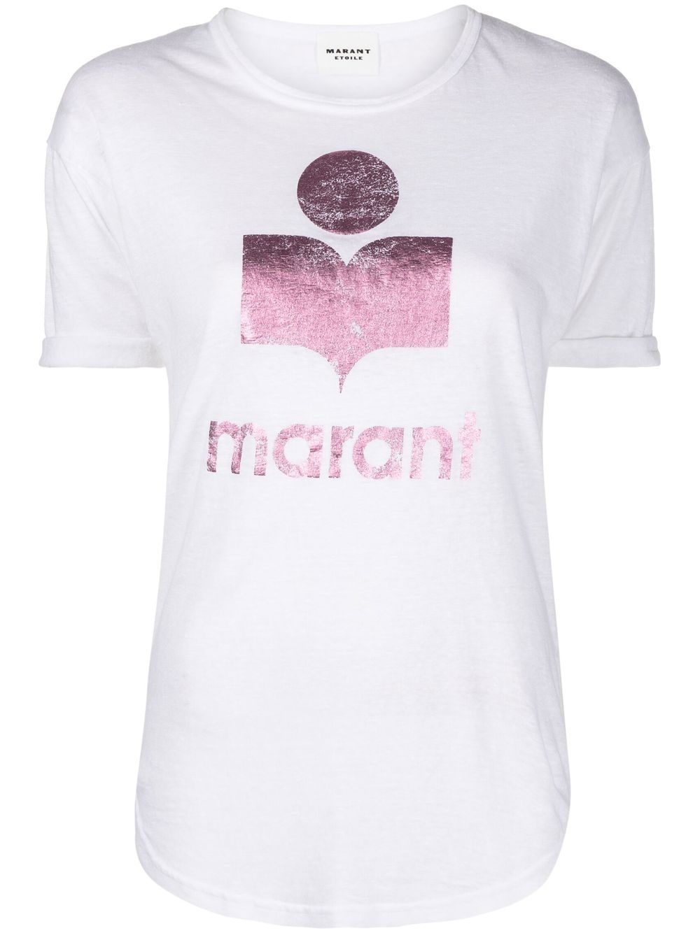 logo-print linen T-shirt Isabel Marant Etoile boasts its signature logo in a statement metallic pink tone, contrasting the solid white background in this classic T-shirt for SS23. Highlights - Cloud white/light pink - Linen - Logo print to the front - Metallic effect - Round neck - Short sleeves - Straight hem Imported Composition Linen/Flax 100% SIZE & FIT Model measurements Height 5 ft 10 in(1.78 m) Bust/Chest 31.49 in(80 cm) Hips 35.43 in(90 cm) Waist 24.4 in(62 cm) Washing instructions Hand Wash