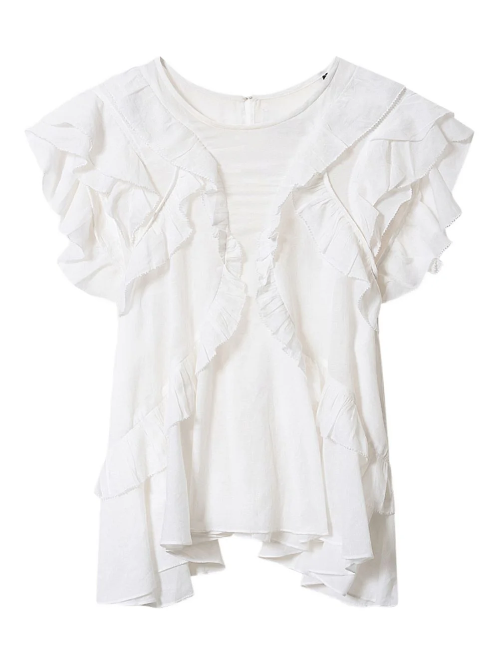 Nalou ruffled top Highlights - White - Ruffles - Round neck - Sleeveless - Keyhole at the rear Imported Composition Cotton 80%, Viscose 20% Washing instructions Read Manufacturer Guidelines