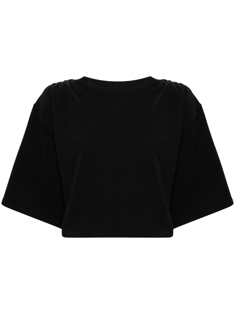 Perolina T-shirt Highlights - Black - Organic cotton - Jersey texture - Crew neck - Ruched detailing - Short sleeves - Cropped - Straight hem Imported Composition Organic Cotton 100%, Polyester 100% SIZE & FIT Model measurements Height 5 ft 10 in(1.77 m) Bust/Chest 32.28 in(82 cm) Hips 35.03 in(89 cm) Waist 25.19 in(64 cm) FittingInformation Designed for a relaxed fit, this piece allows for comfort and movement when worn Made from a midweight non-stretch fabric, this piece offers minimal elasticity when worn This piece fits true to size – take your usual size