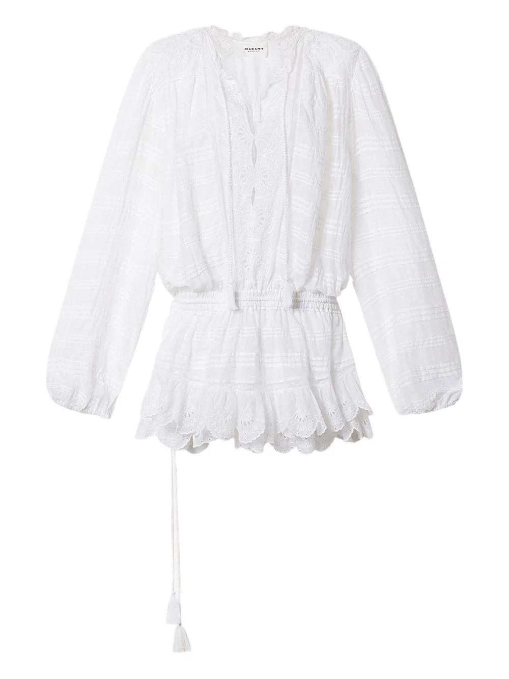 Preya laced mini dress Highlights - White - Lace detail - Striped pattern - Elasticated waist - Scalloped hem - Tassel detail Imported Composition Cotton 75%, Polyester 25% Washing instructions Read Manufacturer Guidelines