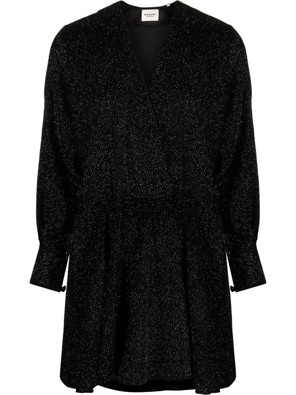 Alexane long-sleeve dress Isabel Marant Etoile elevates the classic mini black dress with a shimmer finish for SS23. The long-sleeved garment is cut in a soft flared design for an elegant look. Highlights - Black - Shimmer finish - V-neck - Wrap design - Long sleeves - Fitted waistline - A-line skirt - Above-knee length Imported Composition Outer: Polyester 100% Lining: Viscose 100% SIZE & FIT Model measurements Height 5 ft 11 in(1.8 m) Bust/Chest 31.49 in(80 cm) Hips 35.43 in(90 cm) Waist 25.19 in(64 cm) Measurement HIPS 37 in(94 cm) LENGTH 33.85 in(86 cm) WAIST 25.19 in(64 cm) FittingInformation This piece fits true to size. We recommend you get your regular size Designed for a loose fit with a close fit at the waist Made with a mid-weight non-stretch fabric Washing instructions Machine Wash
