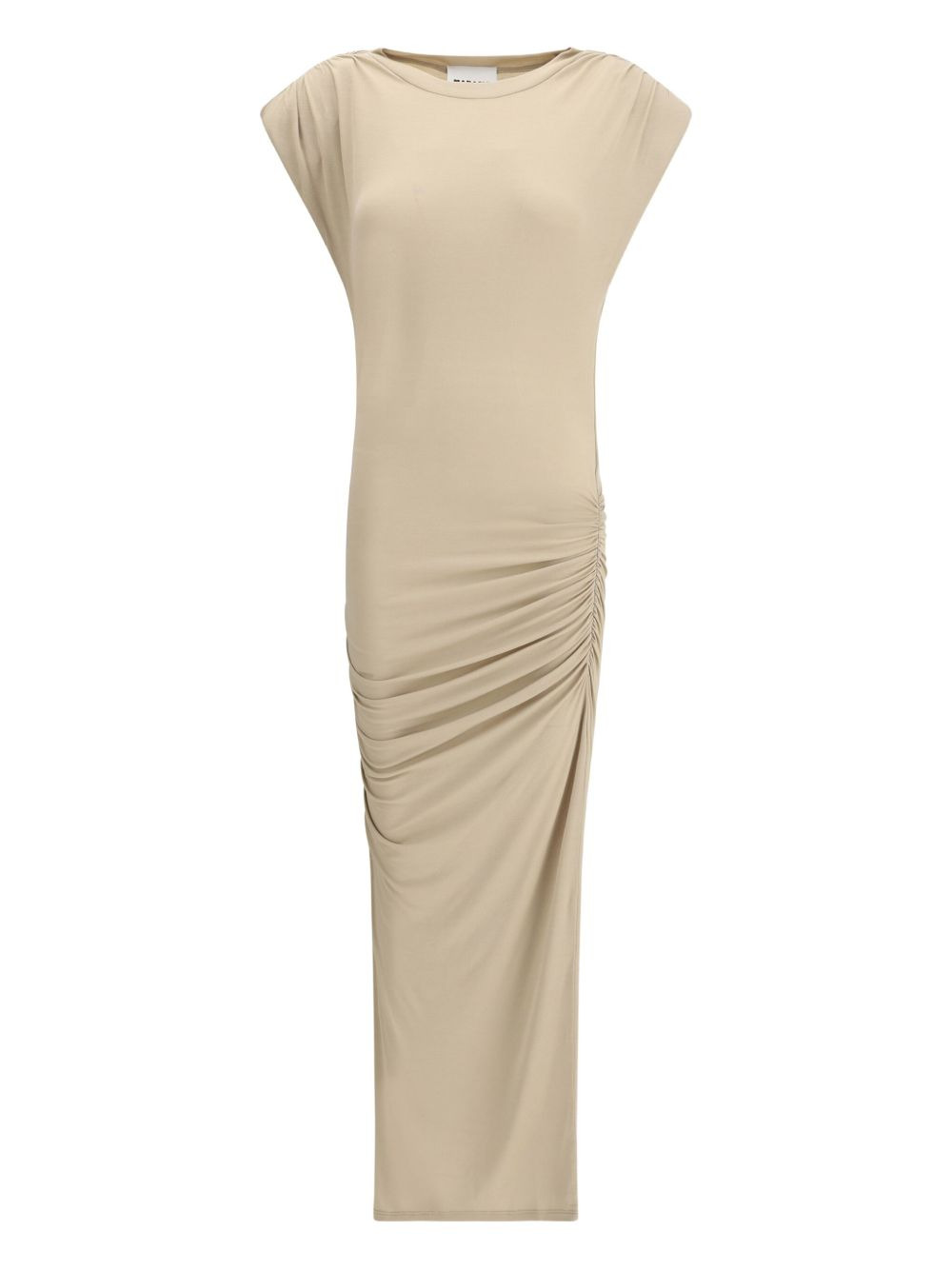 side-ruched midi dress Highlights - Beige - Ruched detailing - Short sleeves - Round neck - Gathered effect Imported Composition Modal 97%, Elastane 3% Washing instructions Read Manufacturer Guidelines