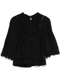 Frany blouse Highlights - Black - Rear button fastening - Mock neck - Short sleeves - Scallop edge Imported Composition Fabric 100% SIZE & FIT Model measurements Height 5 ft 10 in(1.78 m) Bust/Chest 33.46 in(85 cm) Hips 36.22 in(92 cm) Waist 23.22 in(59 cm) FittingInformation Designed for a relaxed fit, this piece allows for comfort and movement when worn Washing instructions Dry Clean Only