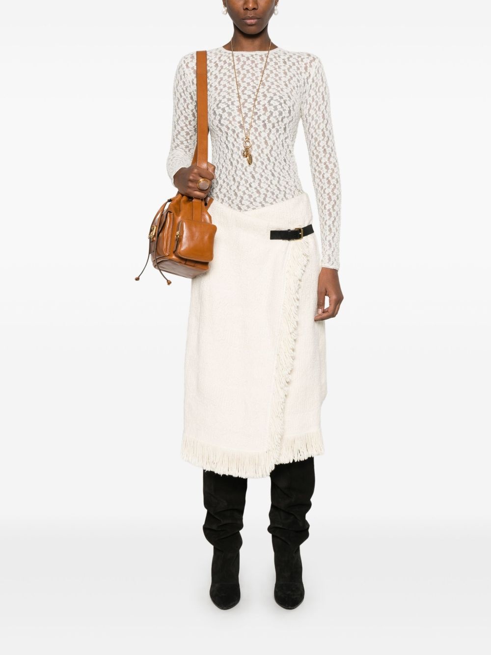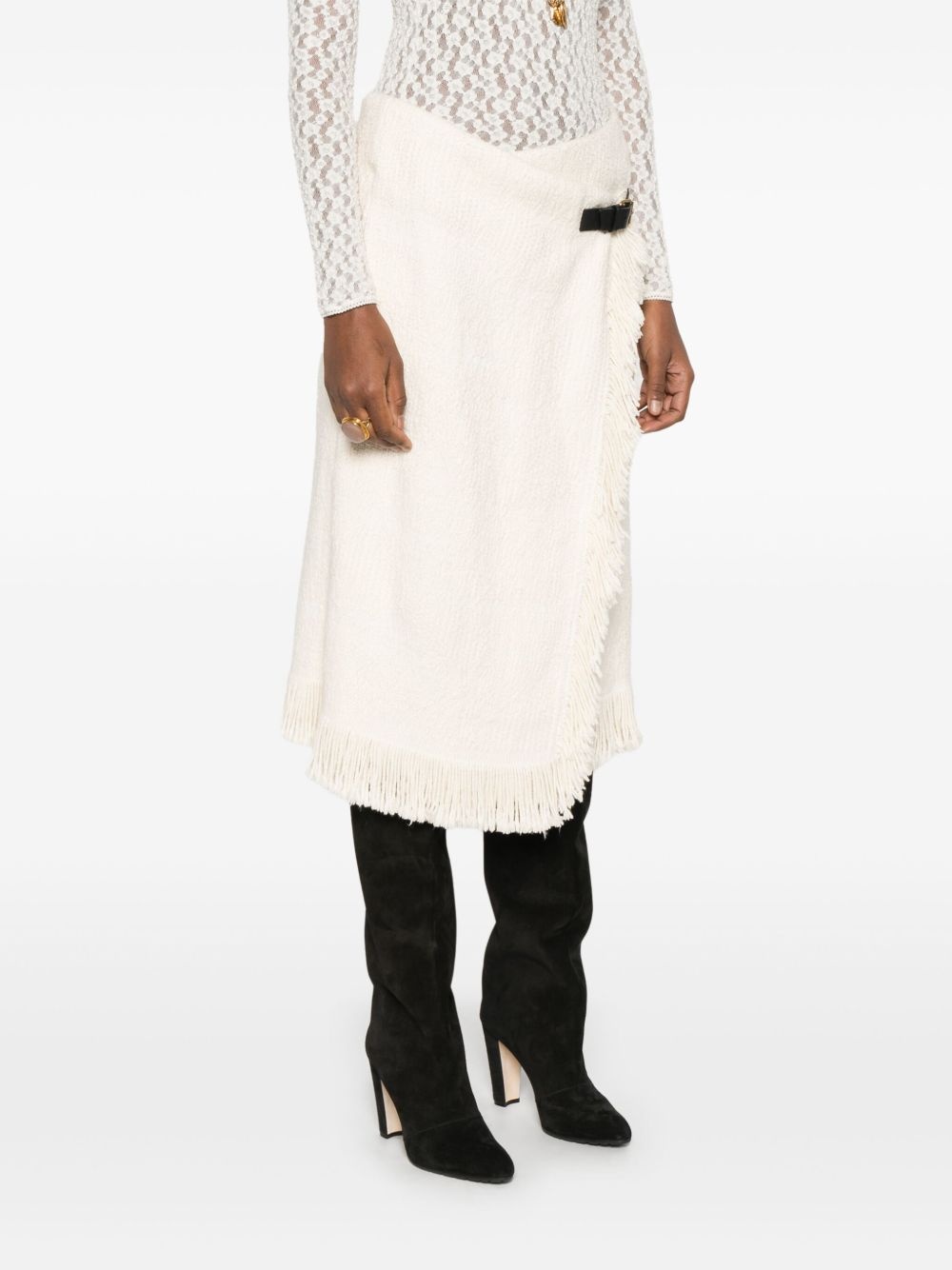 Galla skirt Highlights - Ecru - Side button fastening - Front buckle fastening - Fringed edge Imported Composition Fabric 100% SIZE & FIT Model measurements Height 5 ft 10 in(1.78 m) Bust/Chest 31.49 in(80 cm) Hips 37 in(94 cm) Waist 23.62 in(60 cm) FittingInformation This midi-length skirt is intended to be worn just below the waist