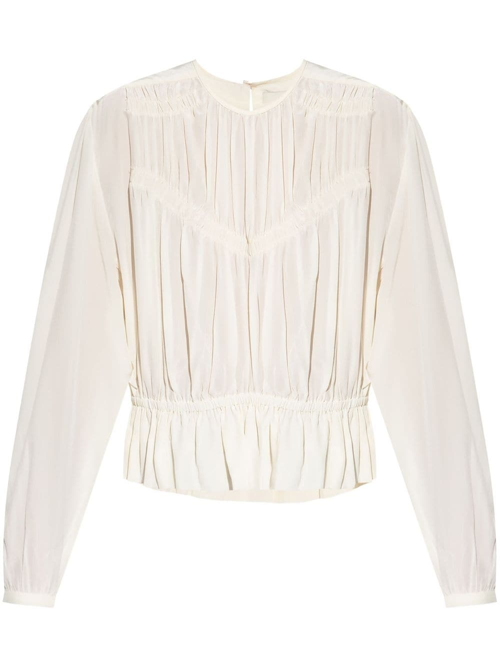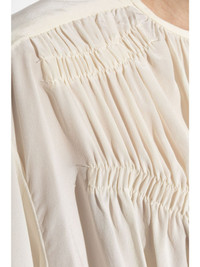 Gelina gathered blouse Highlights - Ecru - Crepe texture - Gathered detailing - Elasticated panelling - Round neck - Single rear button fastening - Long sleeves - Buttoned cuffs - Elasticated waistband - Ruffle hem Made in Italy Composition Silk 100% SIZE & FIT FittingInformation Designed for a relaxed fit, this piece allows for comfort and movement when worn The elasticated waist allows for a comfortable fit Made from a lightweight non-stretch fabric