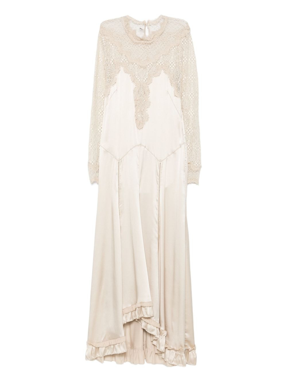 Dolores ruffled dress Highlights - Light beige - Lace bodice - Ruffled hem - Long sleeves - Round neck Imported Composition Silk 94%, Cotton 67%, Polyamide 28%, Lycra 6%, Elastane 5% SIZE & FIT Model measurements Height 5 ft 10 in(1.79 m) Bust/Chest 31.88 in(81 cm) Hips 35.43 in(90 cm) Waist 23.62 in(60 cm) Washing instructions Dry Clean Only