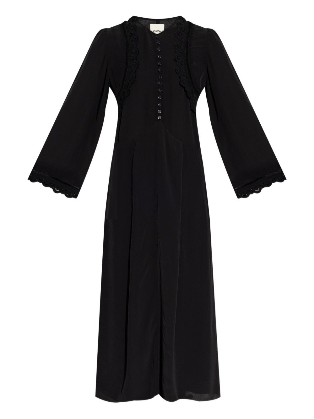 lace-trimmed button-front dress Highlights - Black - Button front fastening - Long sleeves - Lace trim - Scalloped lace hem - A-line skirt Imported Composition Viscose 100% Washing instructions Read Manufacturer Guidelines
