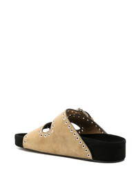 Lennyo eyelet-embellished sandals A nod to Isabel Marant's Western-inspired take on footwear, the Lennyo sandals are adorned with polished silver-tone buckles and eyelets. The hardware contrasts with their supple calf suede construction and muted taupe design. Highlights - Taupe - Calf suede - Eyelet embellishment - Logo-engraved buckle - Silver-tone hardware - Double-strap design - Slip-on style - Open toe - Double buckle fastening - Branded moulded footbed - Flat sole Made in Italy Composition Suede 100% SIZE & FIT Measurement HEEL 0.98 in(2.5 cm) Sole height 0.59 in(1.5 cm)
