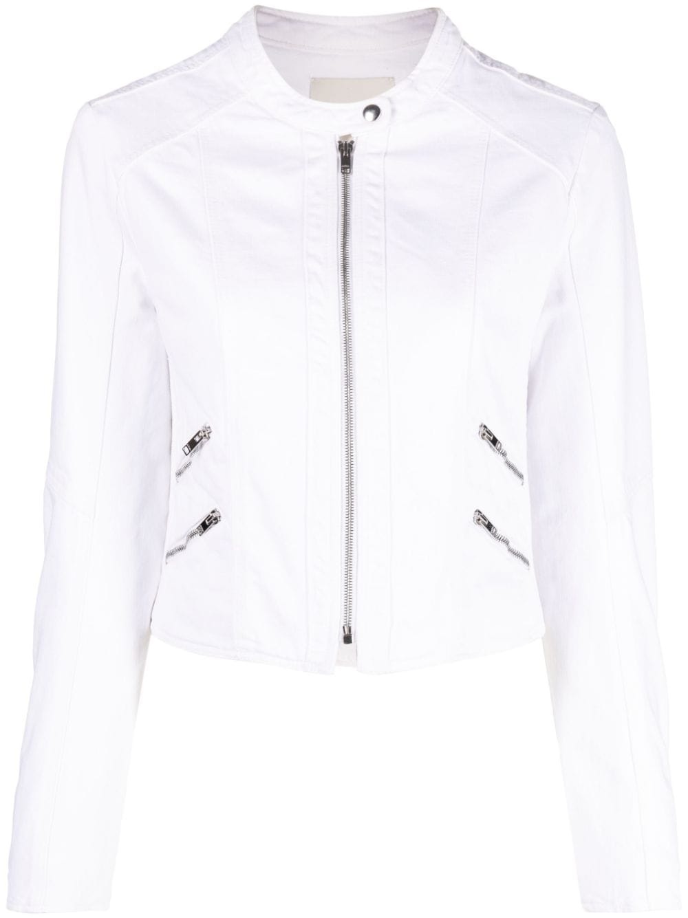 Leys band-collar denim jacket Highlights - Milk white - Cotton - Band collar - Front zip fastening - Front zip fastening pockets - Long sleeves - Straight hem Imported Composition Cotton 100% SIZE & FIT Model measurements Height 5 ft 9 in(1.75 m) Bust/Chest 31.88 in(81 cm) Hips 33.85 in(86 cm) Waist 24.01 in(61 cm) FittingInformation Designed for a slim fit that sits just away from the body offering a close yet comfortable fit Made from a midweight non-stretch fabric This piece fits true to size – take your usual size Washing instructions Machine Wash