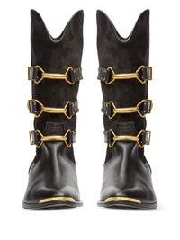Mexia buckle-fastening boots Highlights - Black - Three buckle details - Gold-tone accents - Pointed toe - Stacked heel Made in Italy Composition Outer: Calf Suede 55%, Calf Leather 45% Sole: Calf Leather 100% Lining: Calf Leather 100%
