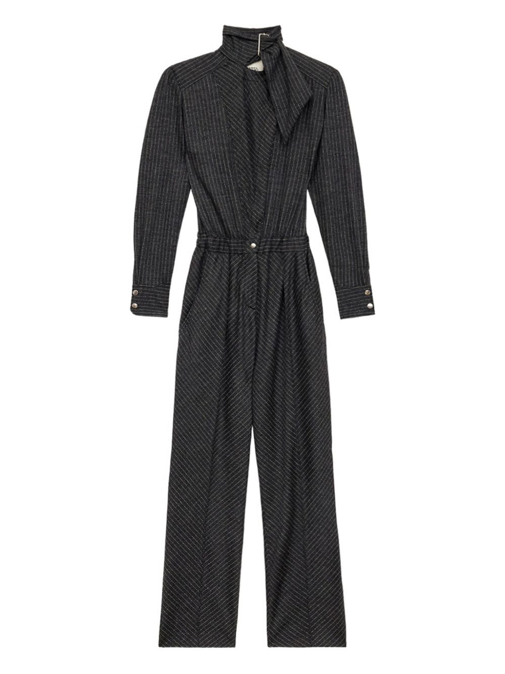 pinstripe high-neck jumpsuit Highlights - Dark grey - Pinstripe pattern - Tie neck detail - Long sleeves - Buttoned cuffs Imported Composition Virgin Wool 86%, Cotton 14% Washing instructions Read Manufacturer Guidelines