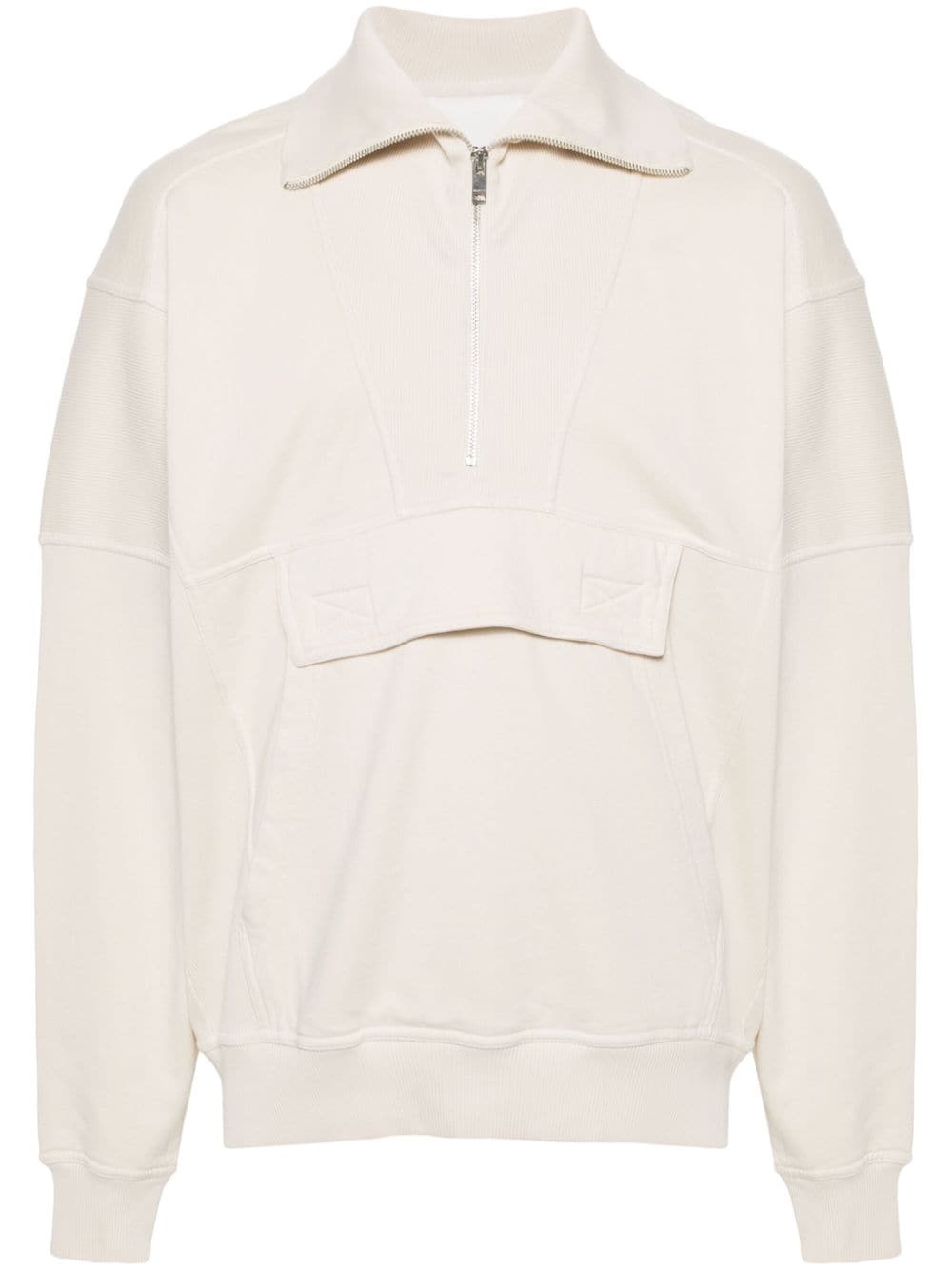 Preston cotton sweatshirt Highlights - Ecru - Cotton - Jersey texture - Ribbed panelling - Funnel neck - Drop shoulder - Long sleeves - Ribbed cuffs and hem - Front pouch pocket - Fleece lining - Straight hem - Short front zip fastening Imported Composition Cotton 100% SIZE & FIT Model measurements Height 6 ft 2 in(1.87 m) Bust/Chest 33.46 in(85 cm) Hips 36.22 in(92 cm) Waist 29.52 in(75 cm) FittingInformation Designed to be unstructured, offering a loose fit throughout Made from a midweight non-stretch fabric, this piece offers minimal elasticity when worn This piece fits true to size – take your usual size