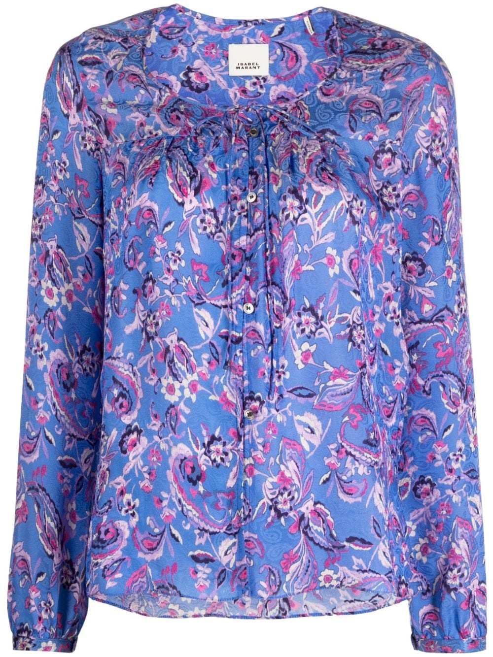 Prian floral-print blouse This silk-blend Prian blouse spotlights ISABEL MARANT’s bohemian aesthetic. It’s adorned with colourful florals and finished with a delicate front tie fastening. Highlights - Blue/multicolour - Silk blend - All-over floral print - Round neck - Front tie fastening - Long sleeves - Straight hem Imported Composition Silk 100% SIZE & FIT Model measurements Height 5 ft 9 in(1.75 m) Bust/Chest 31.49 in(80 cm) Hips 34.05 in(86.5 cm) Waist 24.21 in(61.5 cm) FittingInformation Designed to be unstructured, offering a loose fit throughout Made from a lightweight non-stretch fabric This piece fits true to size – take your usual size