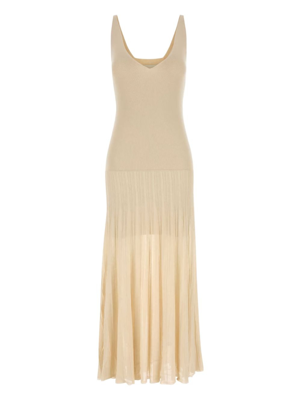 ribbed v-neck midi dress Highlights - Light beige - Ribbed knit - V-neck - Sleeveless - Midi length - Pleated skirt Imported Composition Acetate 100%, Silk 100%, Viscose 100% Washing instructions Read Manufacturer Guidelines