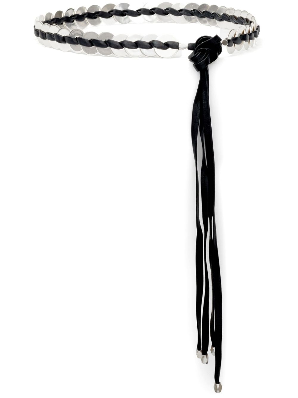 Sevan belt Highlights - Silver-tone/black - Leather/brass - Front tie fastening - Disc detailing - Adjustable fit Imported Composition Lamb Skin 50%, Brass 50% SIZE & FIT Measurement WIDTH 0.98 in(2.5 cm)