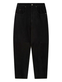 suede trousers Highlights - Black - Suede leather - Front pockets - Back pockets - Button fastening - Topstitching detail Imported Composition Lamb Suede 100% SIZE & FIT FittingInformation Designed for a tapered fit, these trousers allow for a close fit at the waist and a loose unrestricted fit over the leg with a closer fit towards the ankle Washing instructions Read Manufacturer Guidelines