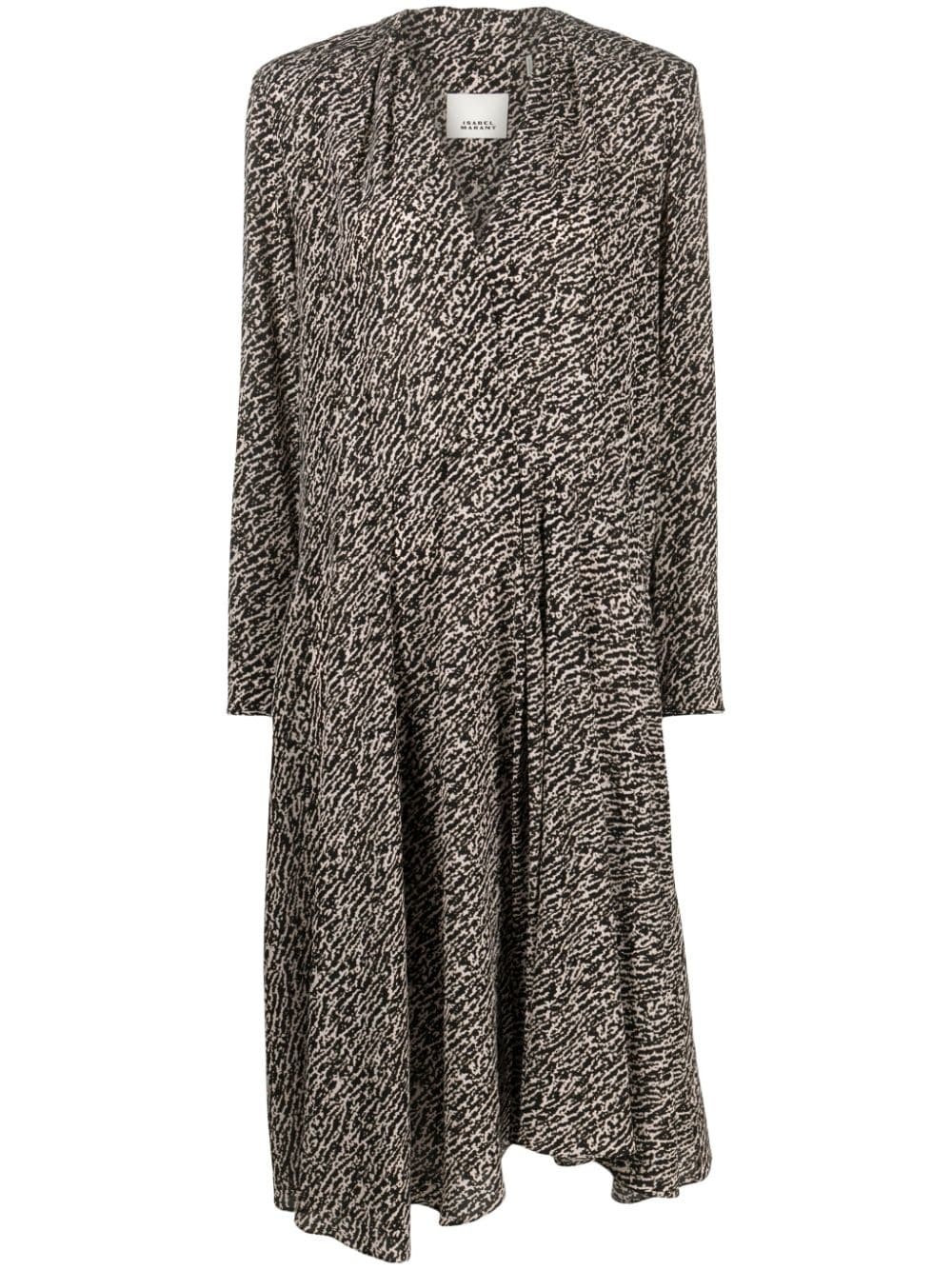 Patel midi dress Showing the brand's sense of Parisian effortlessness, this three-quarter-length sleeve dress from Isabel Marant boasts a casual shift silhouette. Crafted from a blend of silk to a bi-tonal abstract pattern, it ends with an asymmetric hem. Highlights - Black - Silk blend - Shift style - Abstract pattern print - V-neck - Shoulder pads - Three-quarter length sleeves - Asymmetric hem - Mid-length Imported Composition Silk 91%, Elastane 9% SIZE & FIT Model measurements Height 5 ft 11 in(1.8 m) Bust/Chest 31.88 in(81 cm) Hips 35.03 in(89 cm) Waist 24.01 in(61 cm) Washing instructions Dry Clean Only
