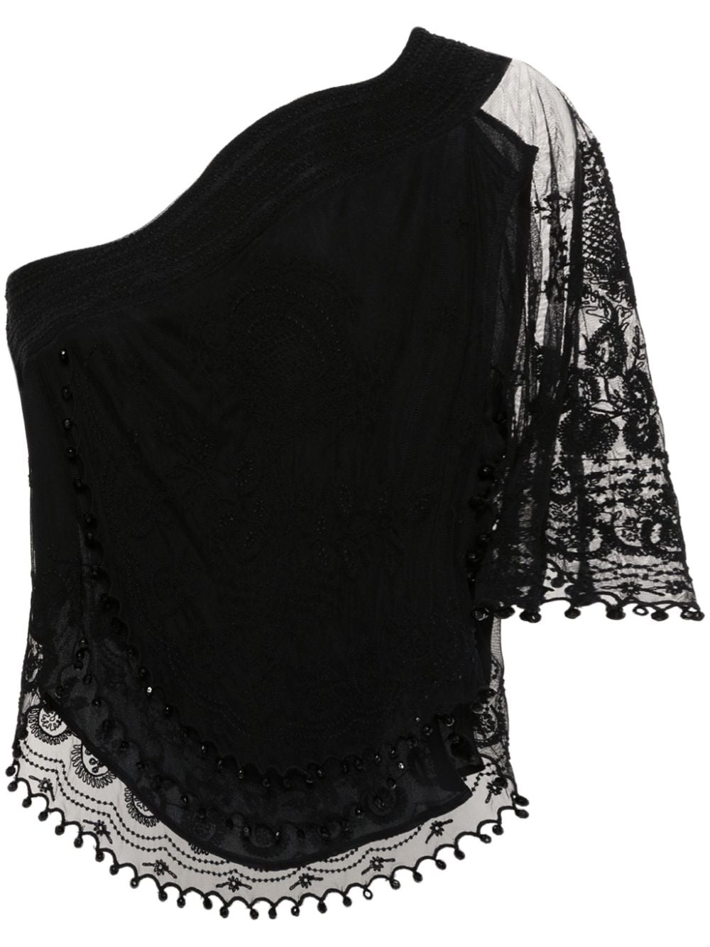Victorine bead-trim blouse Highlights - Black - Mesh design - Semi-sheer construction - All-over floral embroidery - Geometric embroidery - Beaded trim detail - One-shoulder - Single short sleeve - Curved hem - Partial silk lining Imported Composition Outer: Silk 100%, Polyamide 100% Lining: Silk 100% SIZE & FIT Model measurements Height 5 ft 11 in(1.8 m) Bust/Chest 32.67 in(83 cm) Hips 36.22 in(92 cm) Waist 24.4 in(62 cm) FittingInformation Designed for a slim fit that sits just away from the body offering a close yet comfortable fit Made from a midweight non-stretch fabric, this piece offers minimal elasticity when worn This piece fits true to size – take your usual size