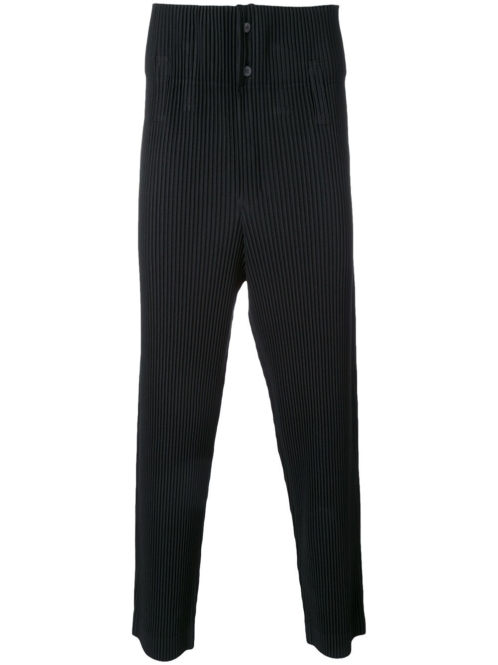 drop-crotch pleated trousers Black drop-crotch pleated trousers from HOMME PLISSE ISSEY MIYAKE. Imported Composition Polyester 100% SIZE & FIT Model measurements Height 6 ft 3 in(1.9 m) Bust/Chest 37.4 in(95 cm) Hips 36.22 in(92 cm) Waist 27.95 in(71 cm) Washing instructions Machine Wash