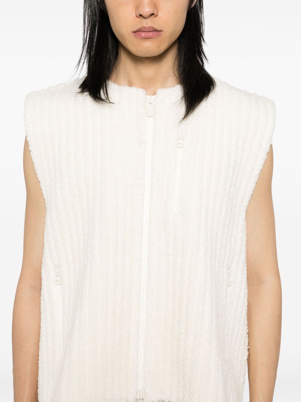 fleeced pleats gilet Highlights - White - Front zip fastening - Zip-fastening chest pocket - Two side zip-fastening pockets Imported Composition Outer: Polyester 85%, Wool 15% Lining: Polyester 100% SIZE & FIT Model measurements Height 6 ft 2 in(1.88 m) Bust/Chest 34.25 in(87 cm) Hips 36.61 in(93 cm) Waist 28.34 in(72 cm) FittingInformation Designed for a relaxed fit, this piece allows for comfort and movement when worn Made from a midweight non-stretch fabric, this piece offers minimal elasticity when worn