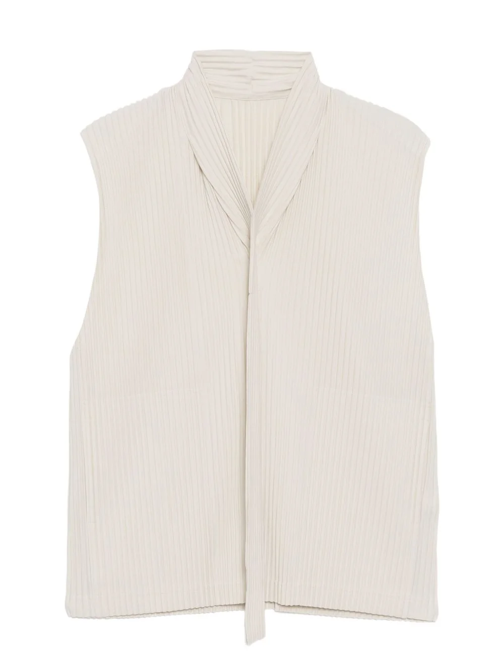 MC: September vest Highlights - Beige Imported Composition Polyester 100% SIZE & FIT Model measurements Height 6 ft 1 in(1.85 m) Bust/Chest 40.15 in(102 cm) Hips 37.79 in(96 cm) Waist 29.52 in(75 cm) FittingInformation Designed for a regular fit allowing for a comfortably loose fit throughout the body The pleated construction on this piece allows for additional movement and flexibility in the fit Washing instructions Machine Wash