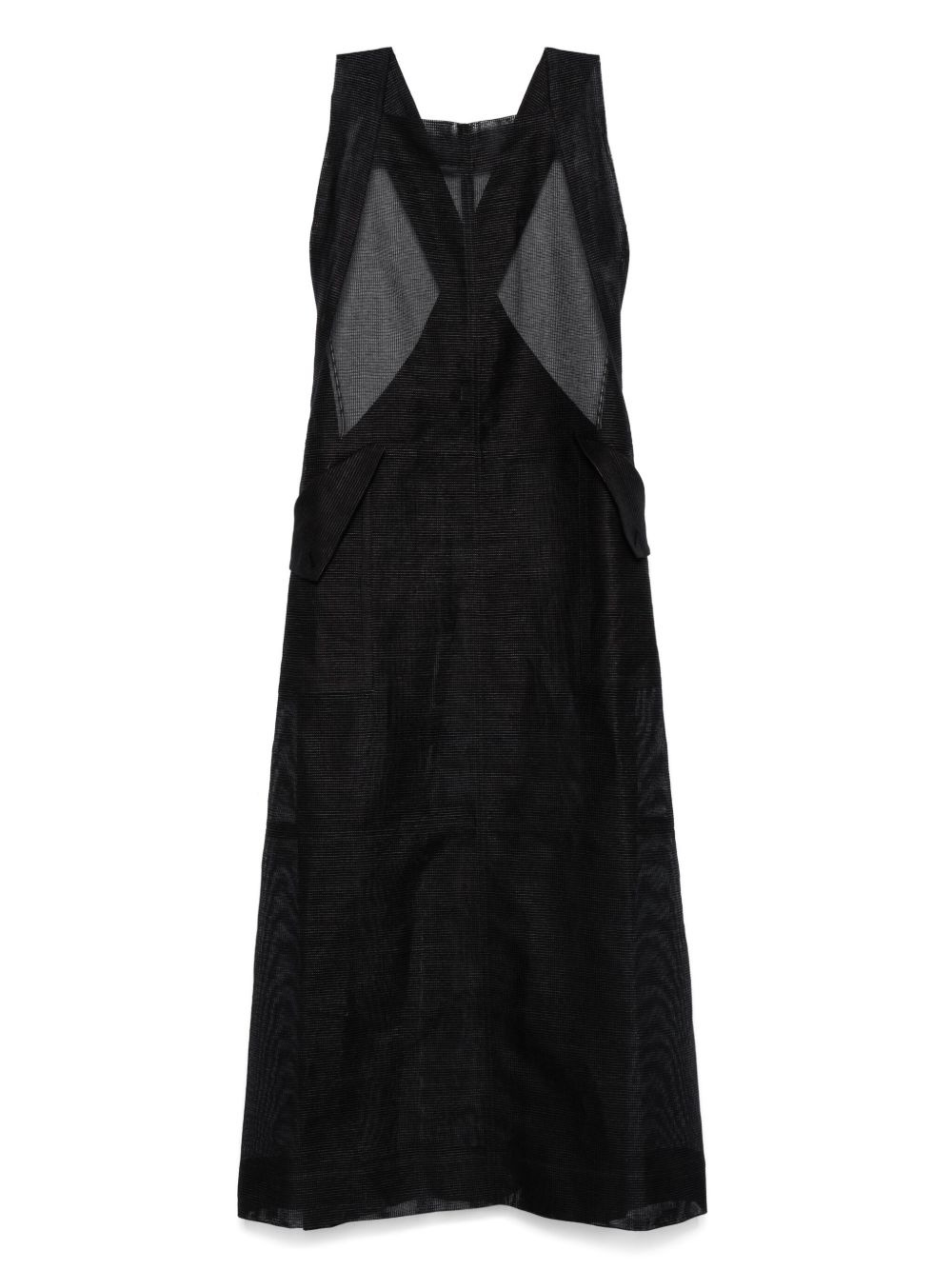 sleeveless midi dress Highlights - Black - Sleeveless design - Patch pockets - Rear criss-cross straps Imported Composition Paper 45%, Ramie 38%, Cotton 17% SIZE & FIT Model measurements Height 5 ft 10 in(1.78 m) Bust/Chest 31.49 in(80 cm) Hips 37 in(94 cm) Waist 23.62 in(60 cm) FittingInformation Designed for a close fit at the chest and waist with a loose fit at the hip Made from a midweight non-stretch fabric Washing instructions Hand Wash