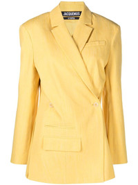 asymmetric double-breasted blazer Sunshine yellow hues and playful yet skillfully executed designs take centre stage at Jacquemus for SS23. Presented in a vibrant shade of yellow, this double-breasted blazer is characterised by an asymmetric design that lends a nod to the designer's offbeat approach to French tailoring. Highlights - Bright yellow - Linen blend - Asymmetric design - Wide notch lapels - Shoulder pads - Long sleeves - Front button fastening - Front welt pocket - Front flap pockets Imported Composition Outer: Linen/Flax 60%, Viscose 26%, Polyester 14% Lining: Acetate 48%, Cotton 46%, Spandex/Elastane 6% SIZE & FIT Model measurements Height 5 ft 10 in(1.77 m) Bust/Chest 31.49 in(80 cm) Hips 33.85 in(86 cm) Waist 22.44 in(57 cm) FittingInformation This piece fits true to size. We recommend you get your regular size Cut for a slim fit Made with a mid-weight non-stretch fabric Washing instructions Dry Clean Only