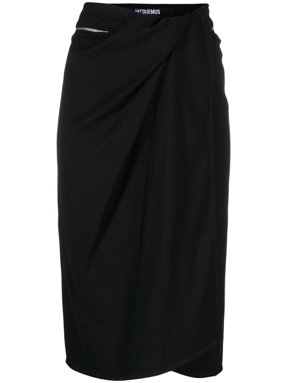 Bodri gathered midi skirt A mirror of Jacquemus' daring attitude, the Bodri midi skirt stands out with a gathered waistline that enhances its wrap design and bold front slit. Highlights - Black - Wrap design - Gathered detailing - High waist - All-around zip fastening - Rear zip-fastening pocket - Straight hem - Mid-length Imported Composition Lining: Polyester 65%, Cotton 35% Outer: Viscose 70%, Virgin Wool 28%, Spandex/Elastane 2% SIZE & FIT Model measurements Height 5 ft 10 in(1.77 m) Bust/Chest 32.67 in(83 cm) Hips 35.43 in(90 cm) Waist 23.62 in(60 cm) FittingInformation This piece fits true to size. We recommend you get your regular size Designed to be fitted at the waist and hips, loose over the leg Made with a mid-weight fabric Washing instructions Dry Clean Only