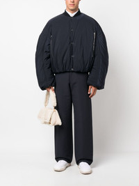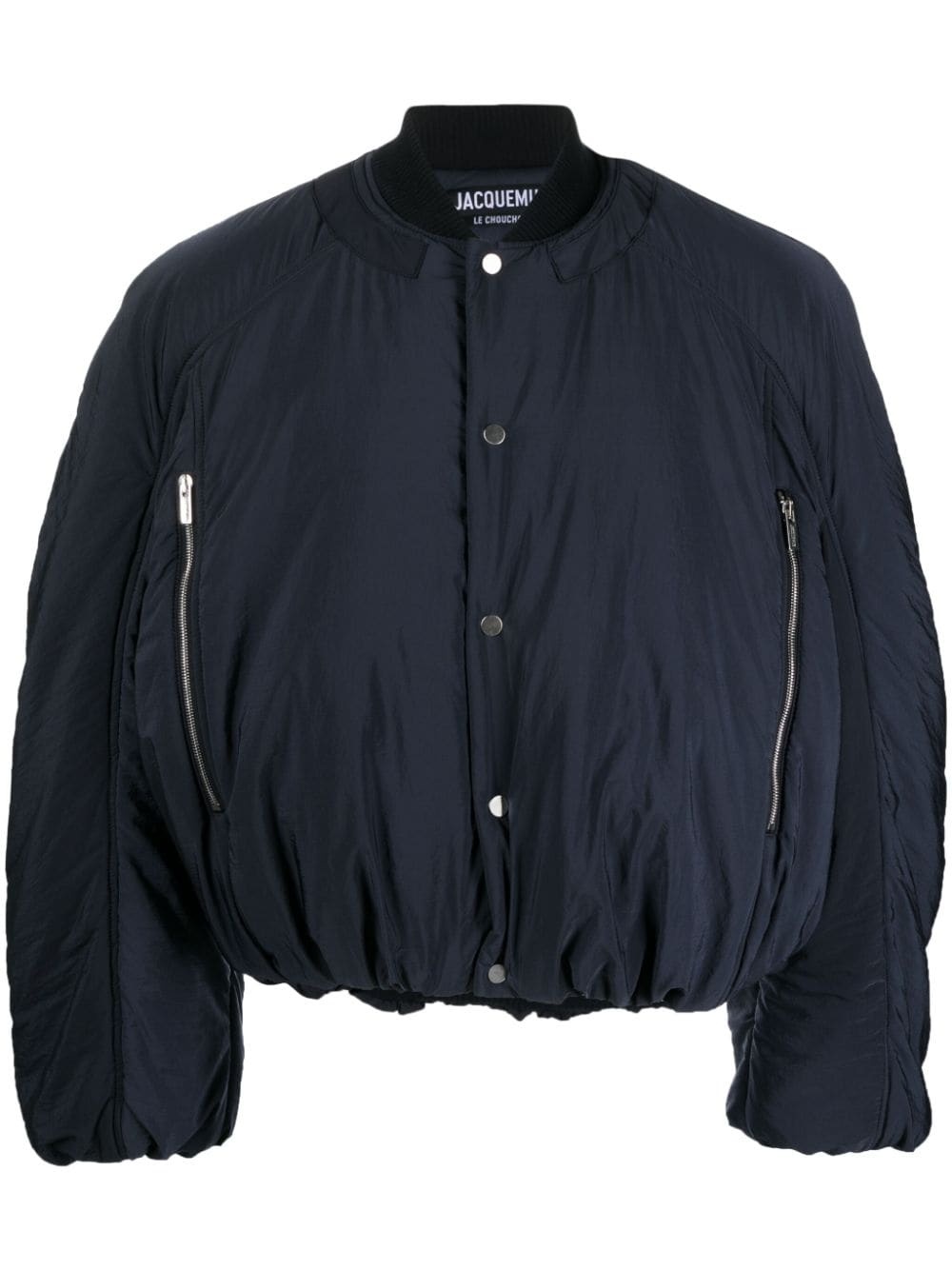 Croissant puffer bomber jacket Drawing inspiration from classic varsity styles, Jacquemus' Croissant puffer jacket is defined by its exaggerated voluminous and round silhouette. It is emblazoned with a signature grosgrain logo ribbon at the rear for a recognisable look. Highlights - Navy blue/white - Padded design - Ribbed band collar - Front press-stud fastening - Two side zip-fastening pockets - Sleeve zip pocket - Long sleeves - Elasticated hem - Elasticated cuffs - Grosgrain logo ribbon at the rear - Fully lined Imported Composition Outer: Polyamide 100% Lining: Polyamide 100%, Cotton 90%, Elastane 10% SIZE & FIT Model measurements Height 6 ft 1 in(1.86 m) Bust/Chest 37.4 in(95 cm) Hips 34.64 in(88 cm) Waist 29.13 in(74 cm) FittingInformation Designed to be unstructured, offering a loose fit throughout The elasticated hem allows for movement and a comfortable fit Made from a padded non-stretch fabric, giving it no natural elasticity This piece fits true to size – take your usual size Measurement CHEST 39.01 in(99.1 cm) SLEEVE LENGTH 27.51 in(69.9 cm) Shoulder Width 19.01 in(48.3 cm) LENGTH 24.48 in(62.2 cm) WAIST 49.01 in(124.5 cm) Washing instructions Dry Clean Only