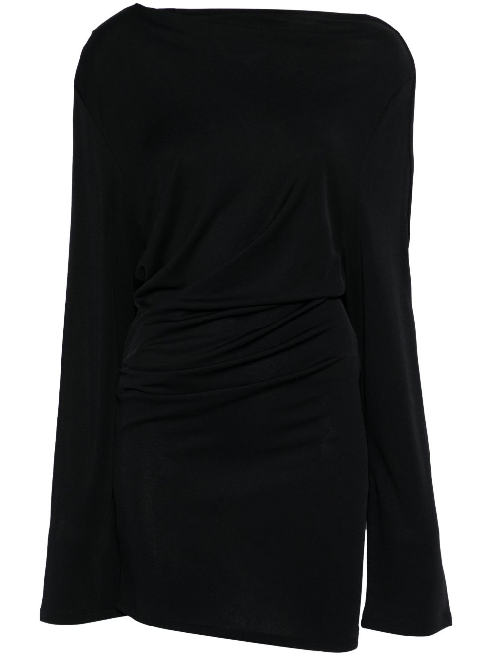 draped mini dress Highlights - Black - Asymmetric neck - Long sleeves - Pleat detailing Imported Composition Viscose 82%, Polyamide 18% SIZE & FIT Model measurements Height 5 ft 11 in(1.8 m) Bust/Chest 32.67 in(83 cm) Hips 35.82 in(91 cm) Waist 25.98 in(66 cm) Measurement SLEEVE LENGTH 25.59 in(65 cm) HIPS 32.28 in(82 cm) LENGTH 34.25 in(87 cm) WAIST 27.55 in(70 cm) FittingInformation Designed for a slim fit that sits just away from the body offering a close yet comfortable fit Made from a midweight non-stretch fabric, this piece offers minimal elasticity when worn