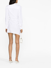 La Robe Bahia draped minidress Jacquemus highlights their tailoring prowess by elevating this classic shirt dress design. Crafted in a fresh white hue, the plunging V-neckline leads into the twist detailing at the waist which creates a fluid, draped silhouette. Highlights - Draped shirt dress from jacquemus featuring white, spread collar, plunging v-neck, front button fastening, long sleeves, buttoned cuffs, draped design and thigh-length. Imported Composition Viscose 88%, Polyamide 12% SIZE & FIT Model measurements Height 5 ft 10 in(1.78 m) Bust/Chest 31.49 in(80 cm) Hips 35.03 in(89 cm) Waist 23.62 in(60 cm) Measurement LENGTH 35.43 in(90 cm) WAIST 26.77 in(68 cm) HIPS 33.07 in(84 cm) FittingInformation Designed for a slim fit that sits just away from the body offering a close yet comfortable fit Made from a midweight non-stretch fabric This piece fits true to size – take your usual size Washing instructions Dry Clean Only