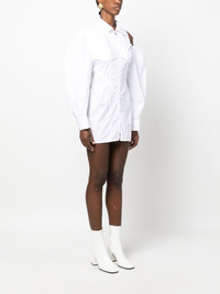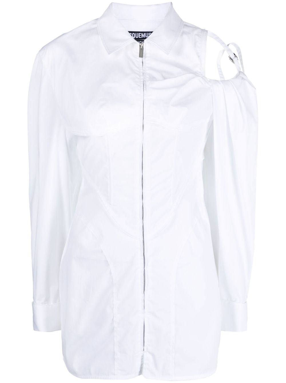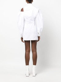 Galliga asymmetric shirt dress Made from a stretch blend of cotton, the Galliga dress is cut to a silhouette-hugging fit as a nod to Jacquemus' tailoring-inspired take on garments. Fastening at the front with a zip, it is elevated with a cut-out detail at the shoulder and playful voluminous sleeves. Highlights - White - Cotton blend - Classic collar - Front zip fastening - Cut-out detailing - Long puff sleeves - Buttoned cuffs - Thigh-length - Straight hem Imported Composition Cotton 96%, Elastane 4% SIZE & FIT Model measurements Height 5 ft 10 in(1.77 m) Bust/Chest 29.92 in(76 cm) Hips 34.25 in(87 cm) Waist 23.62 in(60 cm) Measurement HIPS 34.64 in(88 cm) LENGTH 31.1 in(79 cm) WAIST 25.98 in(66 cm) Washing instructions Hand Wash