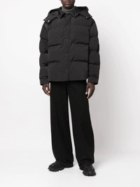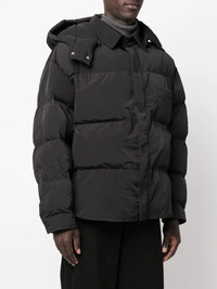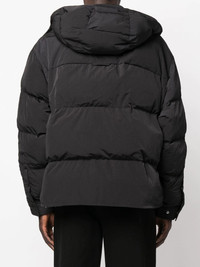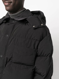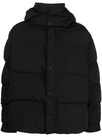 hooded padded jacket black padded design detachable hood pointed flat collar front press-stud fastening chest patch pocket long sleeves straight hem Made in Italy Composition Outer: Polyamide 100% Lining: Polyester 100%, Polyethylene 100% SIZE & FIT Model measurements Height 6 ft 2 in(1.87 m) Bust/Chest 36.41 in(92.5 cm) Hips 37 in(94 cm) Waist 29.52 in(75 cm) FittingInformation This piece fits true to size. We recommend you get your regular size Cut for a loose fit Made with a mid-weight non-stretch fabric Washing instructions Dry Clean Only