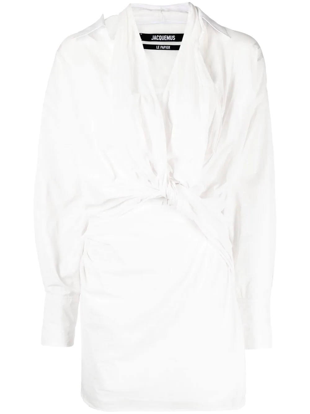 knot-detail shirt dress Jacquemus' distinctive approach to minimalist style is showcased on this shirt dress through exaggerated details such as knot detailing at the front alongside an understated tonal colourway. Imported Composition Cotton 100% SIZE & FIT Model measurements Height 5 ft 10 in(1.78 m) Bust/Chest 30.7 in(78 cm) Hips 36.22 in(92 cm) Waist 23.62 in(60 cm) FittingInformation This piece fits true to size. We recommend you get your regular size Cut for a slim fit Made with a lightweight non-stretch fabric Washing instructions Dry Clean Only