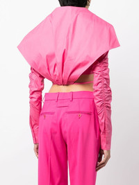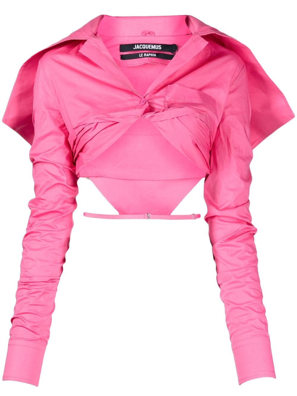 La Chemise Meio cropped shirt Testament to Jacquemus’ penchant for inventive silhouettes, this shirt is a statement take on classic tailored styles. It’s cut from pink cotton poplin to a cropped cape-style silhouette. The adjustable front strap creates a graphic cut-out look. Highlights - Flamingo pink - Cotton blend - Poplin texture - Pointed flat collar - Cape design - V-neck - Front button fastening - Belted waist - Long sleeves - Chest patch pocket - Cropped Imported Composition Cotton 98%, Elastane 2% SIZE & FIT Model measurements Height 5 ft 10 in(1.77 m) Bust/Chest 31.49 in(80 cm) Hips 35.43 in(90 cm) Waist 25.19 in(64 cm) Measurement LENGTH 28.34 in(72 cm) WAIST 25.98 in(66 cm) BUST 30.7 in(78 cm) Washing instructions Hand Wash
