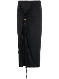 La jupe pareo Croissant midi skirt Highlights - Black - Stretch-design - High-waisted - Gathered detailing - Knot detailing - Side slit - Calf-length Imported Composition Cupro 93%, Spandex/Elastane 7% SIZE & FIT Model measurements Height 5 ft 9 in(1.75 m) Bust/Chest 31.49 in(80 cm) Hips 34.05 in(86.5 cm) Waist 24.21 in(61.5 cm) Measurement HIPS 30.7 in(78 cm) LENGTH 33.46 in(85 cm) WAIST 25.19 in(64 cm) FittingInformation This midi-length skirt is intended to be worn high on the waist Made from a midweight stretch fabric, this piece offers elasticity and flexibility when worn This piece fits true to size – take your usual size
