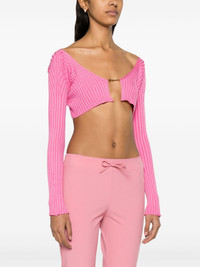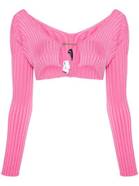 La Maille ribbed shrug cardigan Jacquemus spotlights a statement take on the classic cardigan with this La Maille Pralu style. Cut for a cropped silhouette with a tactile fuzzy texture, it’s enhanced with a gold-tone logo plaque at the centre. Highlights - Hot pink - Ribbed knit - Gold-tone logo plaque - Open front - Long sleeves - Finished edge - Cropped Made in Italy Composition Viscose 81%, Polyamide 12%, Elastane 4%, Polyester 3% SIZE & FIT Model measurements Height 5 ft 11 in(1.8 m) Bust/Chest 32.67 in(83 cm) Hips 35.82 in(91 cm) Waist 24.8 in(63 cm) Measurement LENGTH 9.44 in(24 cm) SLEEVE LENGTH 23.62 in(60 cm) FittingInformation Designed for a close fit throughout Cropped in length Made with a midweight knit, this piece offers some stretch This piece fits true to size – take your usual size