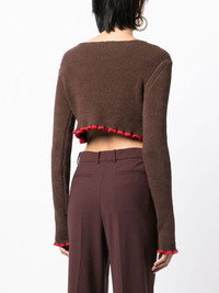 La maille Santon cropped jumper Jacquemus presents its own take on a simple cropped jumper. Crafted from a linen blend, this rib-knit 'La maille Santon' is subtly elevated by a contrasting lettuce detailing at the hem. Made in Italy Composition Body: Linen/Flax 50%, Polyamide 35%, Elastane 15% SIZE & FIT Model measurements Height 5 ft 10 in(1.77 m) Bust/Chest 31.49 in(80 cm) Hips 35.43 in(90 cm) Waist 25.19 in(64 cm) FittingInformation This piece fits true to size. We recommend you get your regular size Cut for a loose fit Made with a mid-weight stretch fabric Washing instructions Hand Wash