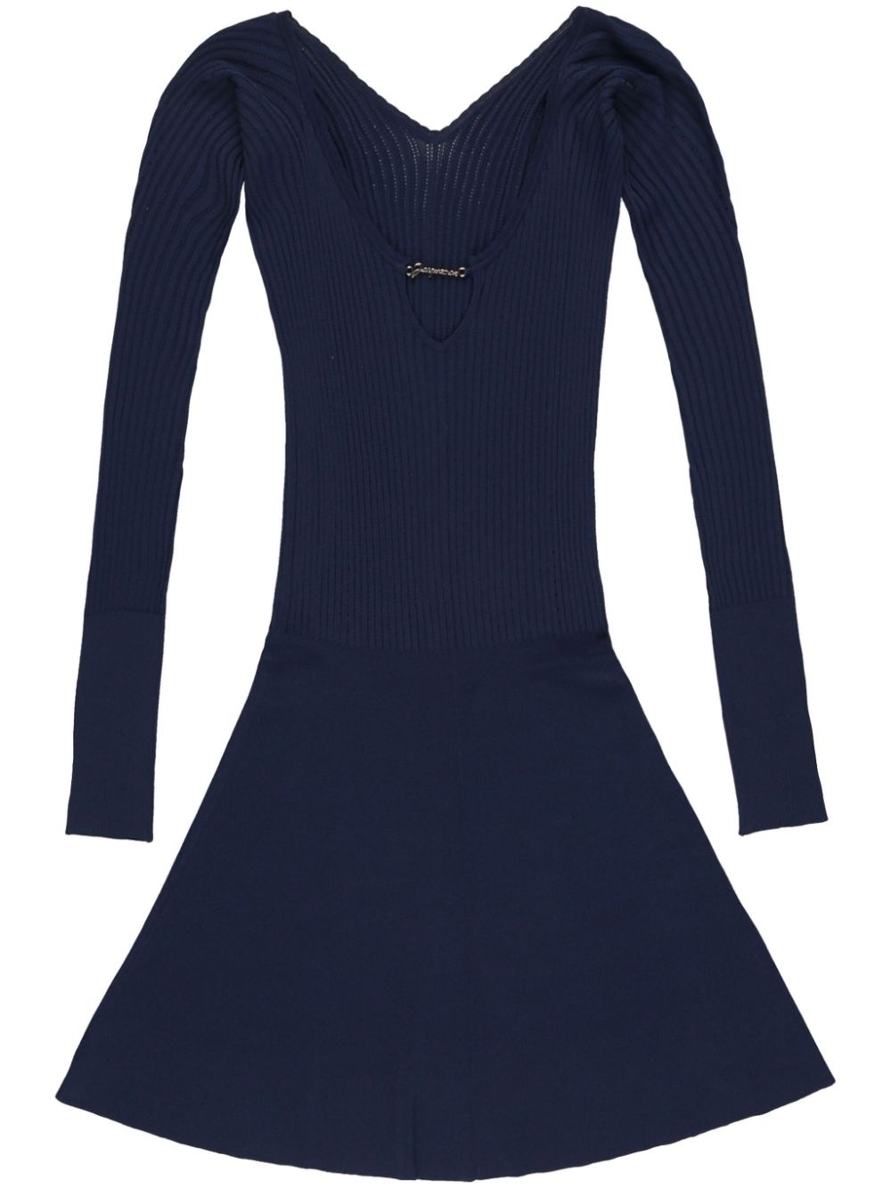 La Mini Robe Pralu dress A brand icon, Jacquemus' logo plaque embellishes the front of this navy-blue La Mini Robe Pralu dress, accentuating the plunging neckline. It's crafted from finely ribbed fabric, boasting a languid mini silhouette. Highlights - Navy blue - Ribbed knit - Logo plaque - V-neck - V-back - Long sleeves - Thigh-length - Straight hem Imported Composition Viscose 94%, Polyester 6%