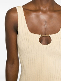La Mini Robe Sierra dress Jacquemus' signature gold-tone logo plaque acts in functional and decorative detail on this La Mini Robe Sierra dress – it’s suspended along the neckline to both create and secure the round cut-out. It’s ribbed-knit from light-yellow threads with pointelle and scalloped trims. Highlights - Light yellow - Ribbed knit - Stretch-design - Pointelle trim - Scoop neck - Gold-tone logo plaque - Cut-out detailing - Sleeveless - Scallop edge - Low back - Thigh-length Imported Composition Viscose 88%, Polyester 12% SIZE & FIT Model measurements Height 5 ft 10 in(1.77 m) Bust/Chest 32.28 in(82 cm) Hips 35.03 in(89 cm) Waist 25.19 in(64 cm) FittingInformation Designed for a close fit throughout Made from a midweight stretch fabric, this piece offers elasticity and flexibility when worn This piece fits true to size – take your usual size Washing instructions Hand Wash