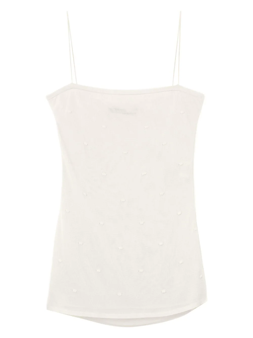 La Plumetis tank top Highlights - Off-white - Fine knit - Square neck - Spaghetti straps - Embroidered design Made in France Composition Viscose 100% Washing instructions Read Manufacturer Guidelines