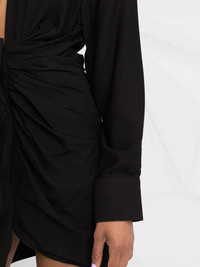 La Robe Bahia draped minidress An iconic Jacquemus silhouette, the Bahia dress presents the label's contemporary take on the classic shirt dress. Seen here in tonal black, the dress is defined by the knotted detail that creates a draped design on the front for a signature look. Highlights - Black - Draped design - V-neck - Long sleeves Imported Composition Viscose 88%, Polyamide 12% SIZE & FIT Model measurements Height 5 ft 10 in(1.78 m) Bust/Chest 30.7 in(78 cm) Hips 35.03 in(89 cm) Waist 23.62 in(60 cm) Measurement SLEEVE LENGTH 31.69 in(80.5 cm) HIPS 35.43 in(90 cm) LENGTH 33.85 in(86 cm) WAIST 25.98 in(66 cm) BUST 31.49 in(80 cm) FittingInformation This piece fits true to size. We recommend you get your regular size Made with a mid-weight non-stretch fabric Washing instructions Dry Clean Only