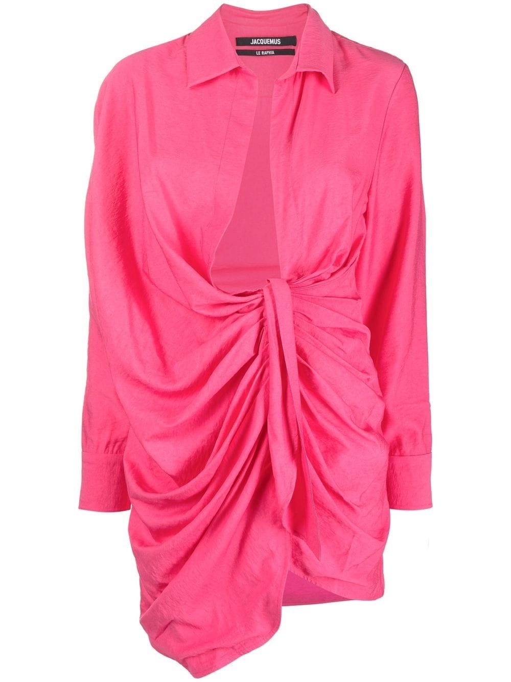 La robe Bahia shirt dress Jacquemus' La robe Bahia shirt dress is characterised by its draped, asymmetric silhouette and plunging neckline that culminates in a knot. It comes in bright pink and is cut to a relaxed design that grazes the thigh. Highlights - Pink - Draped design - Spread collar - Plunging u-neck - Knot detailing - Concealed front button fastening - Long sleeves - Buttoned cuffs Imported Composition Viscose 88%, Polyamide 12% SIZE & FIT Model measurements Height 5 ft 10 in(1.79 m) Bust/Chest 31.1 in(79 cm) Hips 35.03 in(89 cm) Waist 24.01 in(61 cm) Measurement HIPS 32.28 in(82 cm) LENGTH 35.43 in(90 cm) WAIST 26.77 in(68 cm) FittingInformation Designed for a slim fit that sits just away from the body offering a close yet comfortable fit Made from a midweight non-stretch fabric This piece fits true to size – take your usual size Washing instructions Dry Clean Only