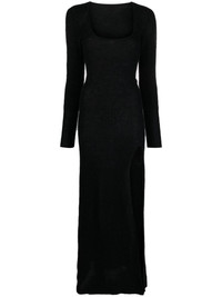 La Robe Dao knitted dress The La Robe Dao dress from Jacquemus embodies the label's signature louche aesthetic. It's crafted from a blend of alpaca and mohair to a sleek, floor-length silhouette with a thigh-high split. Highlights - Black - Alpaca wool-mohair blend - Ribbed knit - Scoop neck - Long sleeves - Side slit - Maxi Imported Composition Lining: Mohair 34% Alpaca 34%, Polyamide 32% SIZE & FIT Model measurements Height 5 ft 10 in(1.78 m) Bust/Chest 33.07 in(84 cm) Hips 36.61 in(93 cm) Waist 24.8 in(63 cm) FittingInformation Designed for a close fit throughout Made with a midweight knit, this piece offers some stretch This piece fits true to size – take your usual size Washing instructions Hand Wash