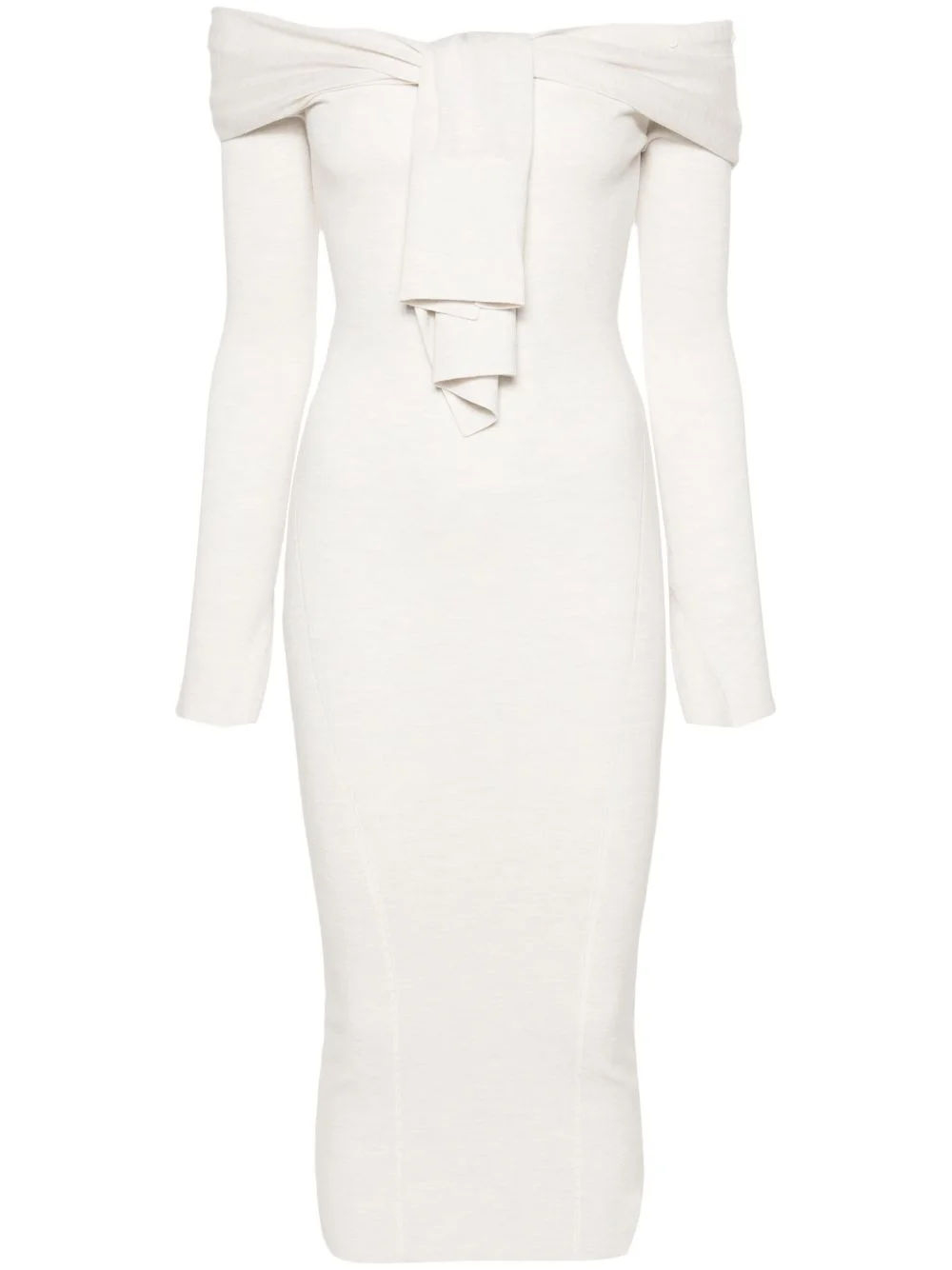 La robe Doble midi dress Highlights - Light beige - Virgin wool blend - Knitted construction - Melange effect - Folded edge - Off-shoulder - Front tie fastening - Long slit sleeves - Fitted waistline - Straight mid-length hem Imported Composition Virgin Wool 81%, Polyamide 18%, Spandex/Elastane 1% SIZE & FIT Model measurements Height 5 ft 9 in(1.76 m) Bust/Chest 31.88 in(81 cm) Hips 35.43 in(90 cm) Waist 24.8 in(63 cm) FittingInformation Designed for a close fit throughout Made with a midweight knit, this piece offers some stretch This piece fits true to size – take your usual size Measurement BUST 27.99 in(71.1 cm) LENGTH 45 in(114.3 cm) WAIST 24.01 in(61 cm) SLEEVE LENGTH 25 in(63.5 cm) HIPS 27.99 in(71.1 cm) Washing instructions Hand Wash
