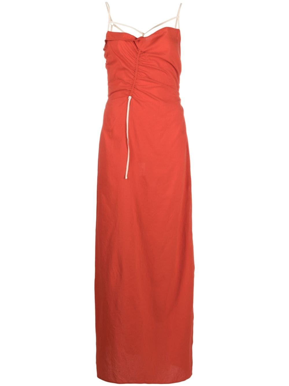 La Robe Gaua long dress The detailing on this design makes for an unmistakable Jacquemus look. Reflecting the brand's innovative approach to fashion, the La Robe Gaua long dress has an elegantly fitted body, ending with a straight skirt. With gathered details and a lingerie-like construction, it’s accentuated by thigh-high side slits. An open back with asymmetric elasticated straps presents one of the label's signature finishes. Highlights - Coral red - Cotton - Gathered detailing - Adjustable draped detailing - Square neck - Elasticated spaghetti straps - Two thigh-high side slits - Concealed side zip fastening - Ankle-length Imported Composition Cotton 100% SIZE & FIT Model measurements Height 5 ft 11 in(1.8 m) Bust/Chest 31.49 in(80 cm) Hips 35.82 in(91 cm) Waist 24.8 in(63 cm) FittingInformation Designed for a close fit at the chest and waist with a loose fit at the hip The adjustable drawstring means that you can adjust this piece’s fit to suit your comfort and preference Made from a midweight non-stretch fabric This piece fits true to size – take your usual size Washing instructions Dry Clean Only