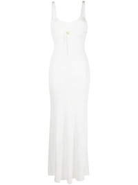 Le Chouchou maxi dress Jacquemus puts a characteristically daring spin on knitwear with this maxi dress, crafting it from a sheer ribbed knit that begins just under the bust and the adjustable metal D-ring belt. Highlights - White - Recycled polyester blend - Ribbed knit - Sheer - Scoop neck - D-ring buckle belt - Sleeveless - Ankle-length Made In Italy Composition Recycled Polyester 78%, Polyester 14%, Polyamide 8% SIZE & FIT Measurement HIPS 31.49 in(80 cm) LENGTH 60.62 in(154 cm) WAIST 28.34 in(72 cm) BUST 26.77 in(68 cm) Washing instructions Hand Wash